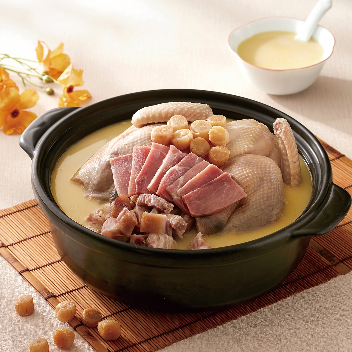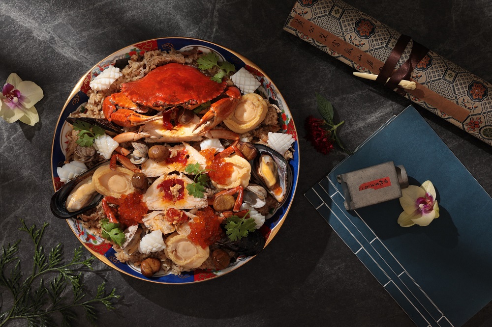 招牌菜「一品佛跳牆」有別於傳統作法,以松茸、銀杏、鮑魚等食材取代炸排骨酥和芋頭,琥珀色的澄清湯頭滋味鮮甜。