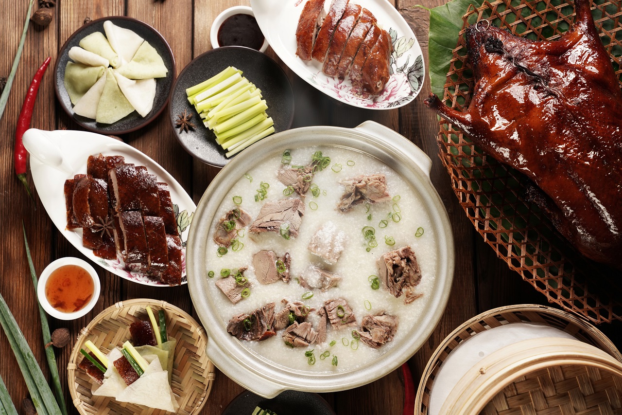 鎮店之寶「火焰片皮鴨(需預訂)」選用來自宜蘭的北京鴨,上菜前由師傅將竹葉青酒淋上鴨身後,點火燃燒至皮脆肉嫩,一上桌香氣迷人!「鴨架粥」則是採用廣式手法煮至米融於粥,口感綿密滑順。