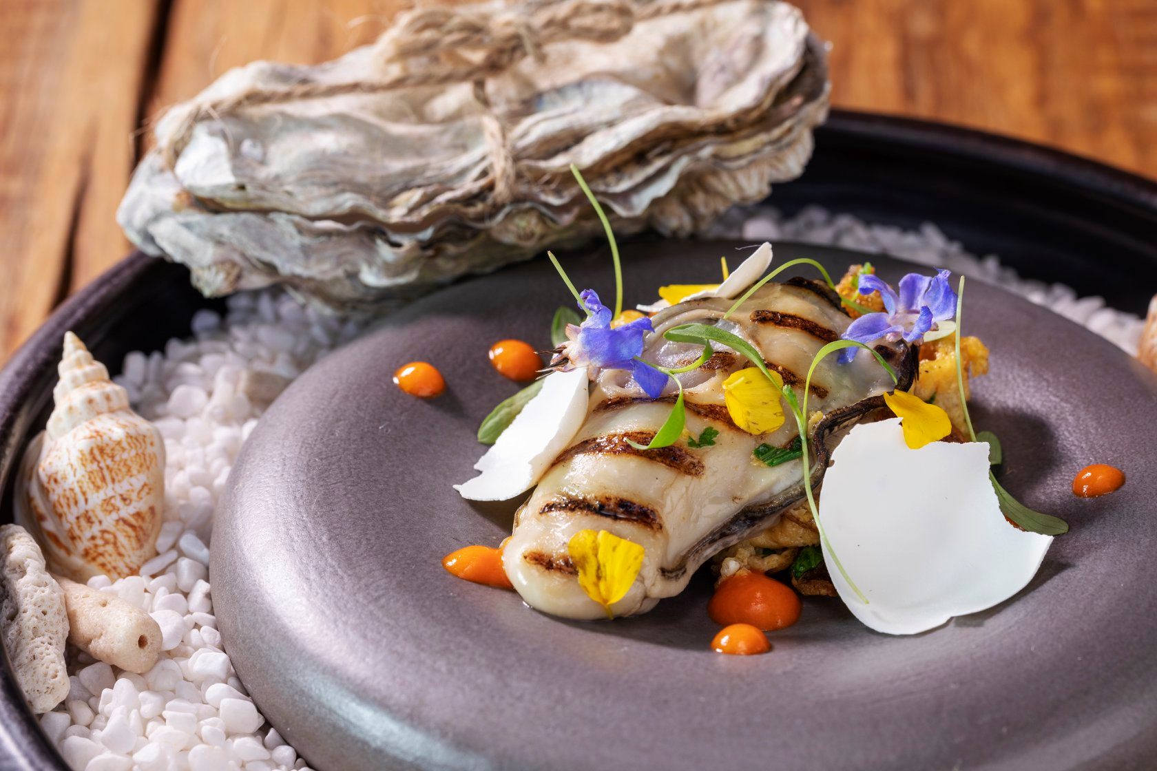 主廚將南投小農栽種的可可、南方澳的現流鮮魚、日月潭的紅玉紅茶等在地食材入菜,以不過度烹煮的料理方式,將台灣食材以地中海料理風格優雅演繹。