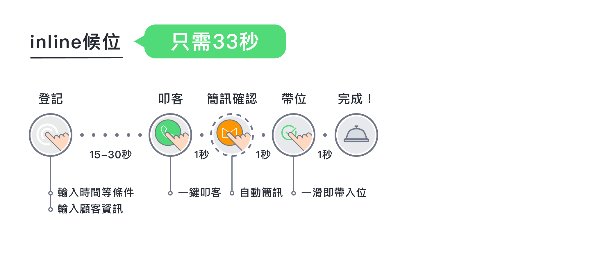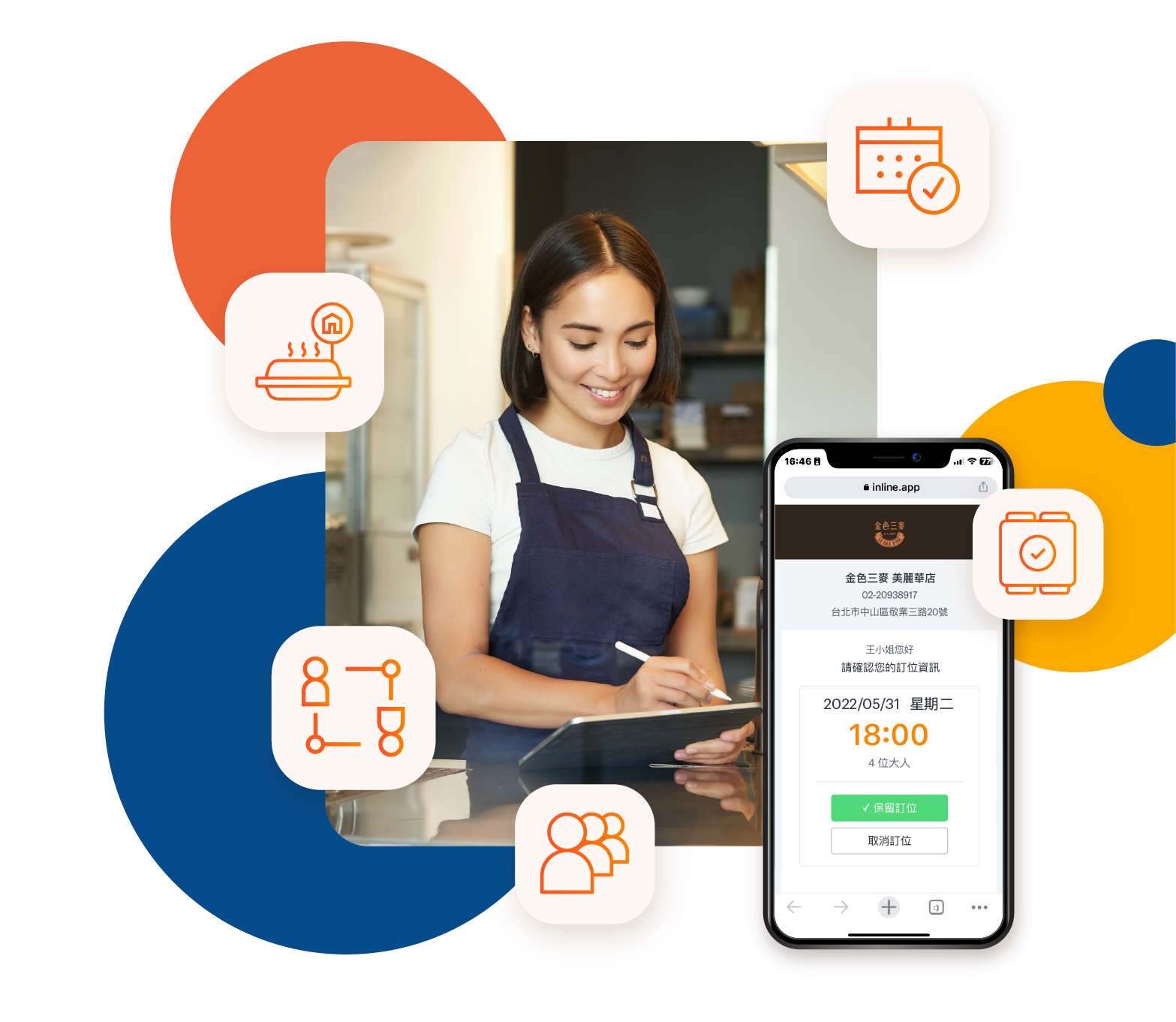 inline 幫餐廳人員省時間成本,加速人潮疏通流程,還能做到一鍵幫餐廳撥打電話的功能,系統客製語音自動跟顧客確認保留候位,餐廳人員就可以專心在帶位及現場其他服務。