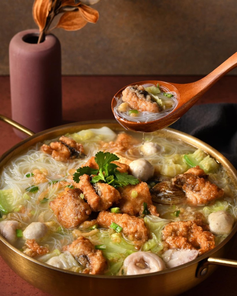 厚實大塊的土魠魚,表層炸得金黃酥脆。鍋裡滿滿的鮮甜白菜、芋頭及丸子等食材;搭配吸附了鮮甜湯汁的滑順米粉,口口滿足。