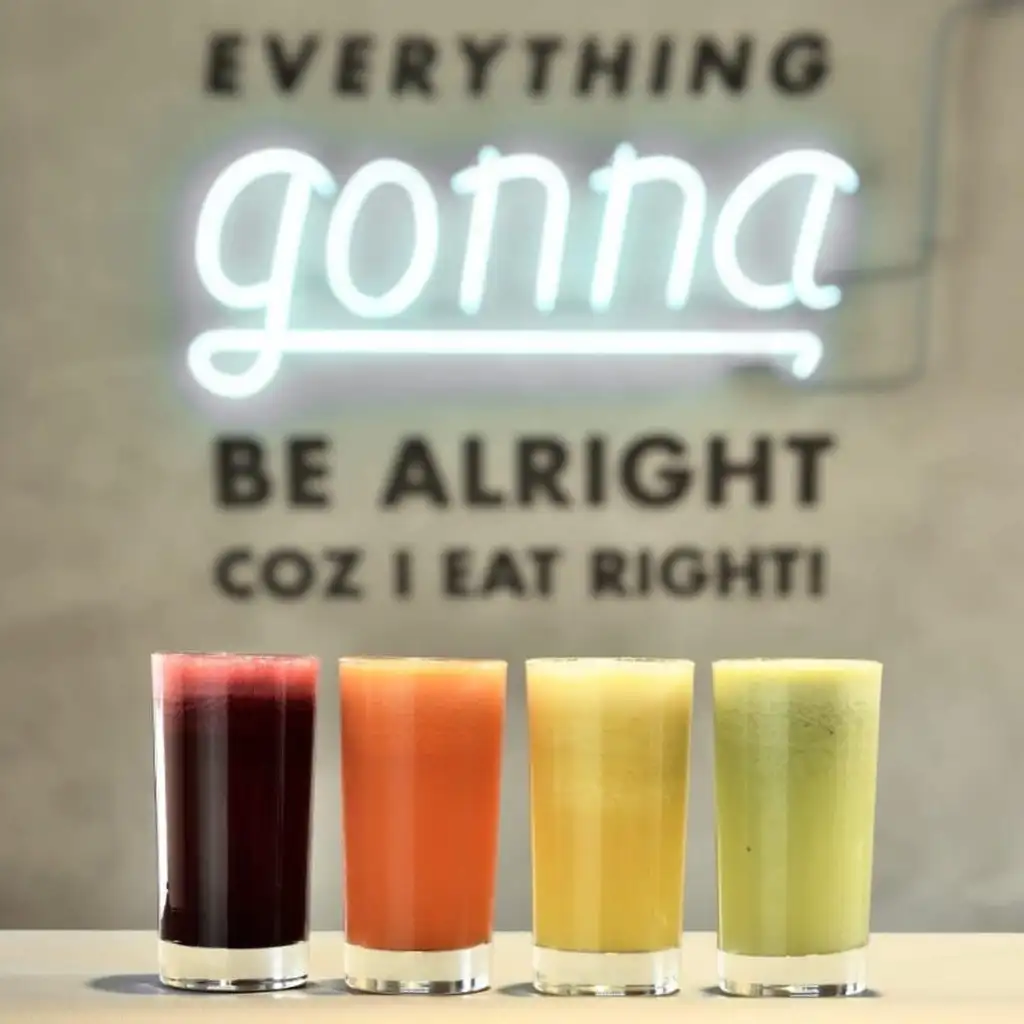 ▲每種果汁各有不同功效。如紫色的「甜菜根果汁」有增加抵抗力的功效,橘色的「胡蘿蔔蘋果汁」則有助抗發炎。圖片來源:gonna FB
