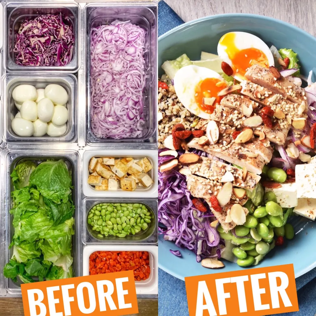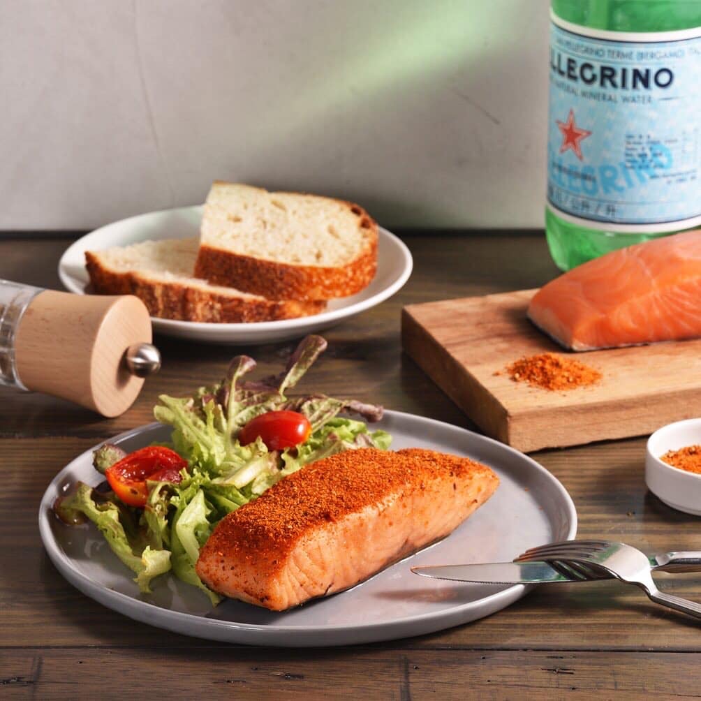 富涵紐奧良 Cajun 風味的香料烤鮭魚,加上低 GI 高纖維的古代穀物 Farro,搭配烤紅心地瓜、野菇、毛豆和羽衣甘藍,營養健康又具飽足感。