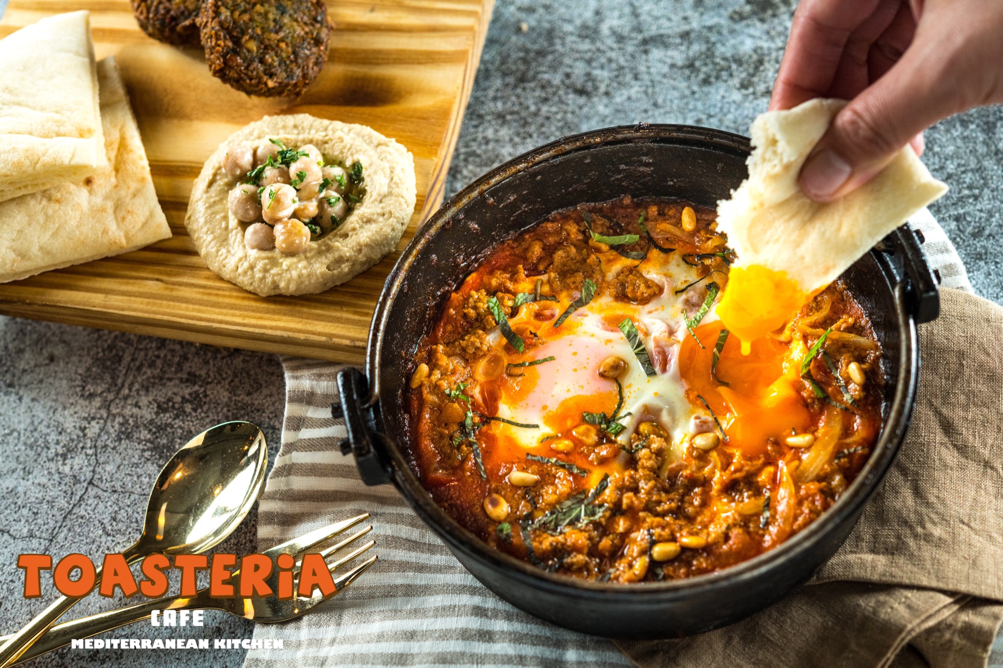 以專賣創意帕尼尼聞名的 TOASTERiA CAFE 吐司利亞,以新鮮的健康食材,搭配來自世界各地的香料,創作出道道細膩的地中海料理。店內以色列早餐「夏卡蘇卡」,以大量的新鮮番茄與洋蔥熬煮,並加入菠菜泥、瑞可達起司與水波蛋。微酸的番茄醬汁,與半熟水波蛋的軟嫩完美搭配,是點餐率超高的人氣餐點!